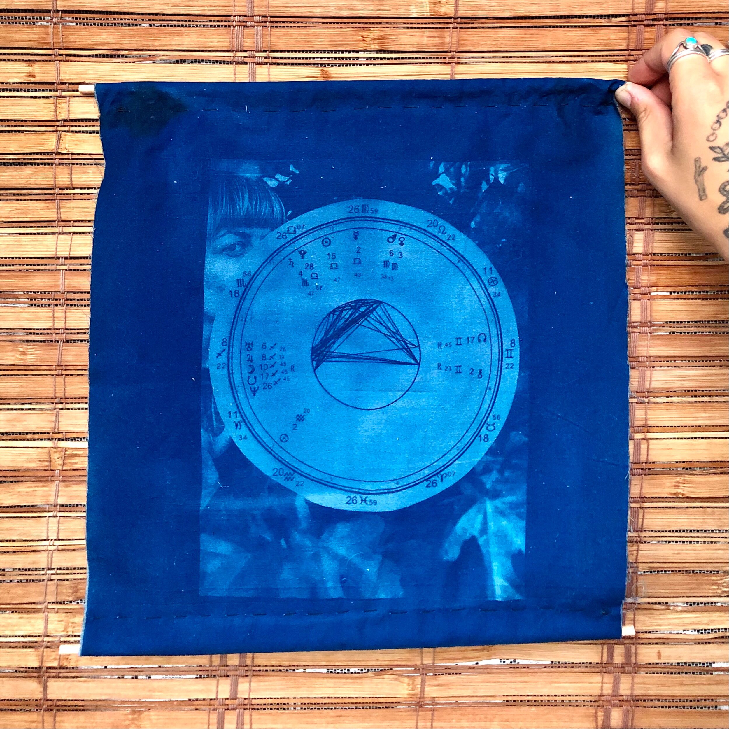 A handmade cyanotype print showing how the planets were aligned the moment you were born - aka your birth chart! Printed on natural canvas fabric with option to integrate additional imagery (i.e. portrait, trees, clouds, flowers), ready to decorate your space ~